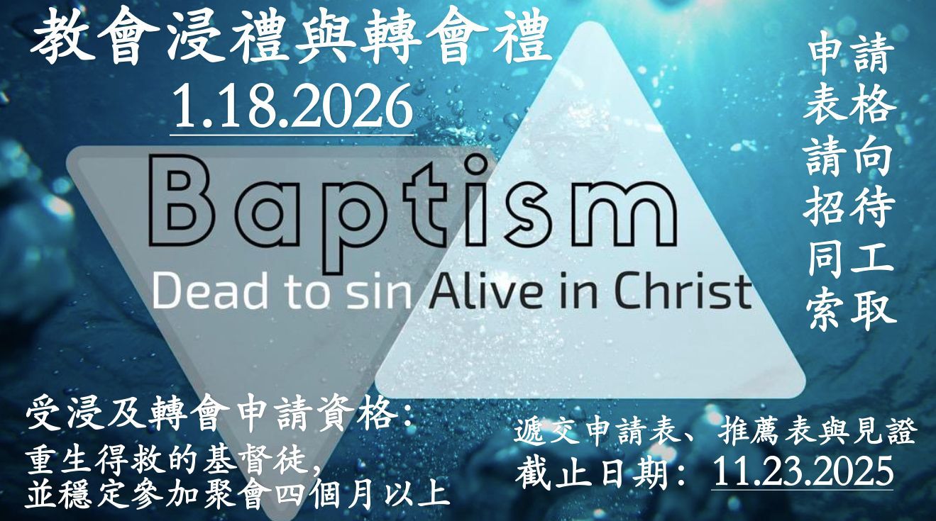 浸禮是基督教重要的聖禮。教會下一期的浸禮與轉會禮將於2026年1月18日舉行。如果你已經是重生得救的基督徒,並且穩定參加聚會4個月以上,你就具備資格申請受浸或者轉會加入聖蓋博谷第一華人浸信會。請在2025年11月23日之前向教會的司事索取申請表、並聯絡小組長。