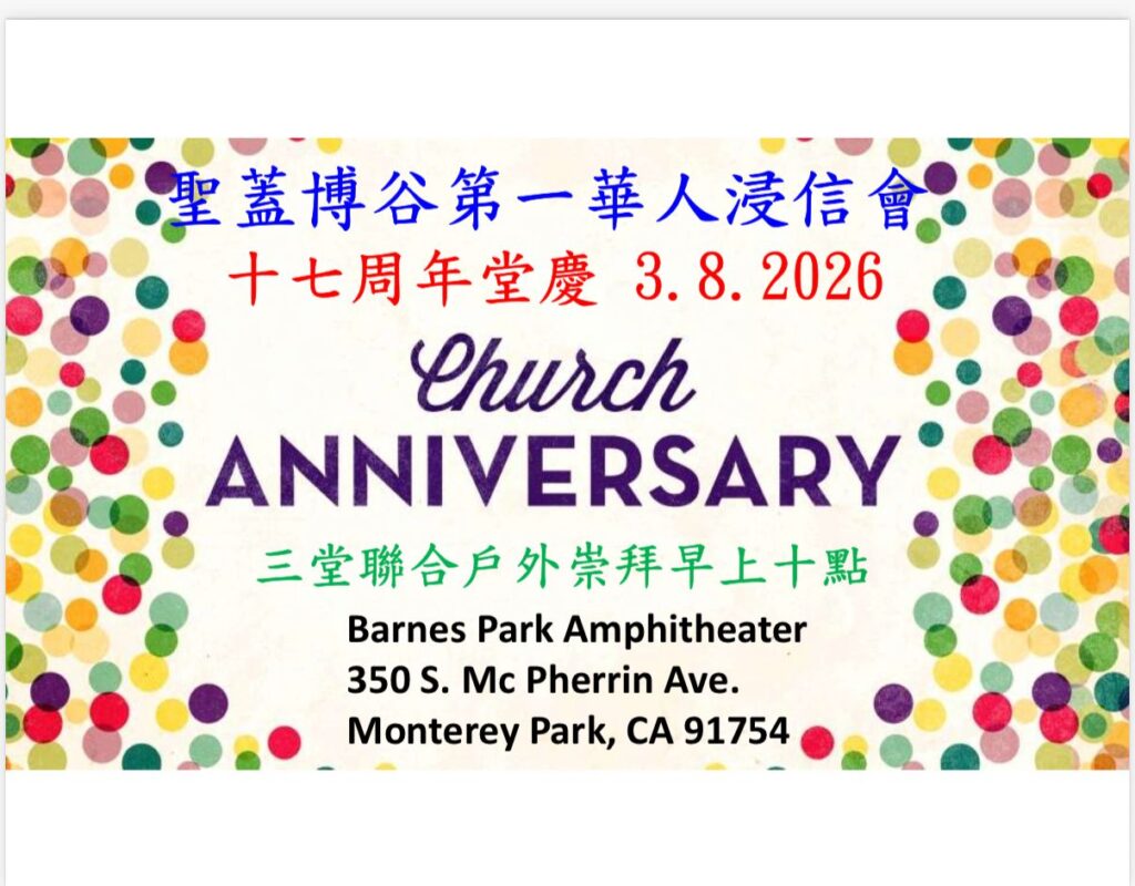 聖蓋博谷第一華人浸信會將於3月8日迎来教會的17週年。 這是一個里程碑! 回顧17年的歷史,盡是上帝的恩典。 讓我們以堂慶來感謝, 讚美上帝。
